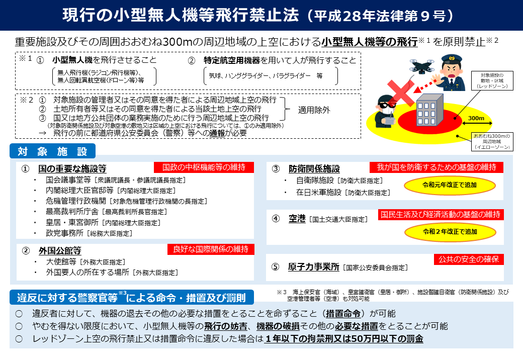 この法律は警察庁が所管しており、2015年の総理大臣官邸屋上へのドローン落下事件をきっかけに制定されました。