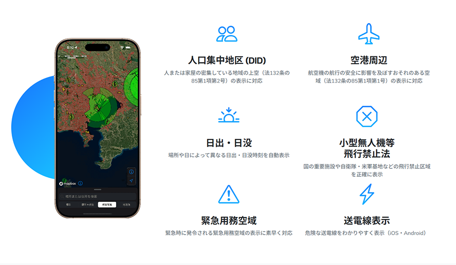 これはDJIのドローン製品と連携し、飛行禁止区域や飛行制限情報を提供します。