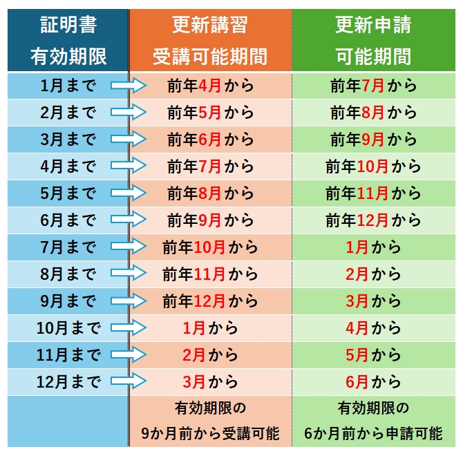 なお、更新講習は「更新申請から3ヶ月前に修了したもの」までが有効であることから、更新講習は有効期限満了日の9ヶ月前から受講が可能です。