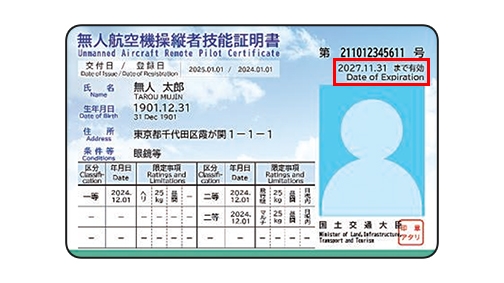 ドローン国家資格(技能証明)の有効期限は3年間です。