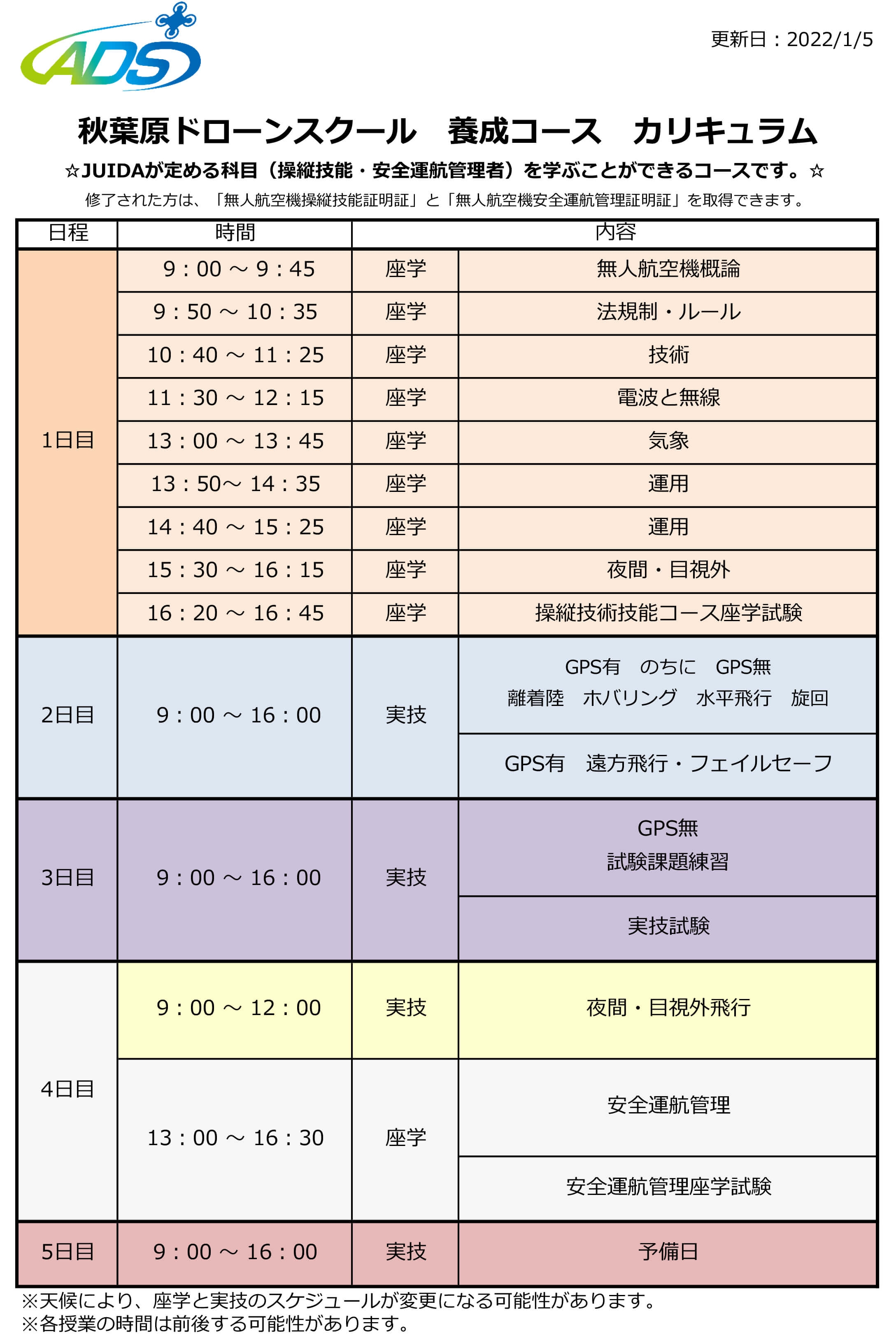秋葉原ドローンスクール(ADS)は、平日クラスと土日クラスの2クラスからお選びできます。